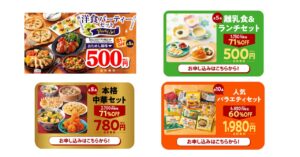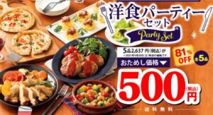この期間中は、通常2,637円相当の洋食パーティーセットが81%OFFで500円(税込・送料無料)で試せる大変お得なキャンペーンが実施中です。ほかにも離乳食セットや中華セット、人気ミックスセットなど複数の種類からお選びいただけます。