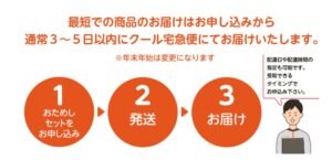 - 商品到着:3〜5日以内にヤマト運輸の冷凍クール便で自宅に届く